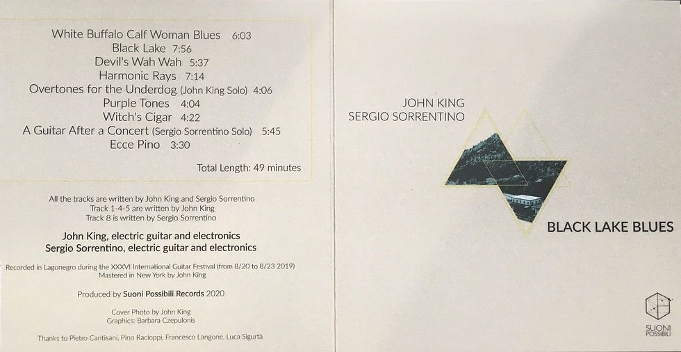 I'm proud to announce the release of my new album: "Black Lake Blues" by John King & Sergio Sorrentino - Avant Blues and Experimental Music for 2 Electric Guitars. Free Streaming on Spotify https://open.spotify.com/album/2CMx8SAIX84wfCQheQR98S… Buy Digital Album and Eco Pack Physical CD here: https://suonipossibili.bandcamp.com/releases